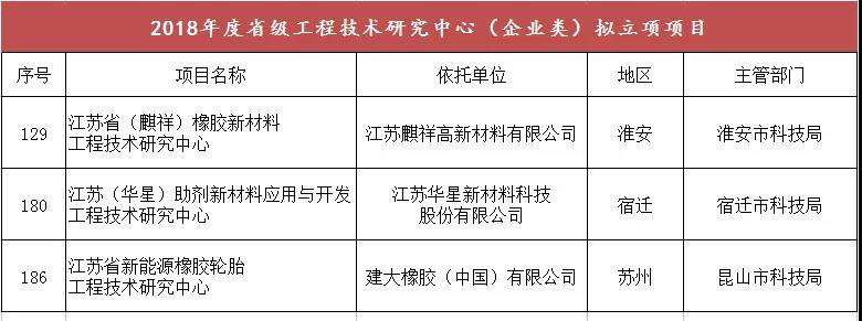10月8日,江蘇省公示了“2018年度省級(jí)工程技術(shù)研究中心擬立項(xiàng)項(xiàng)目”,在本次共有3家橡膠企業(yè)的研究中心入選,分別是建大橡膠、麒祥化工和華星新材料。