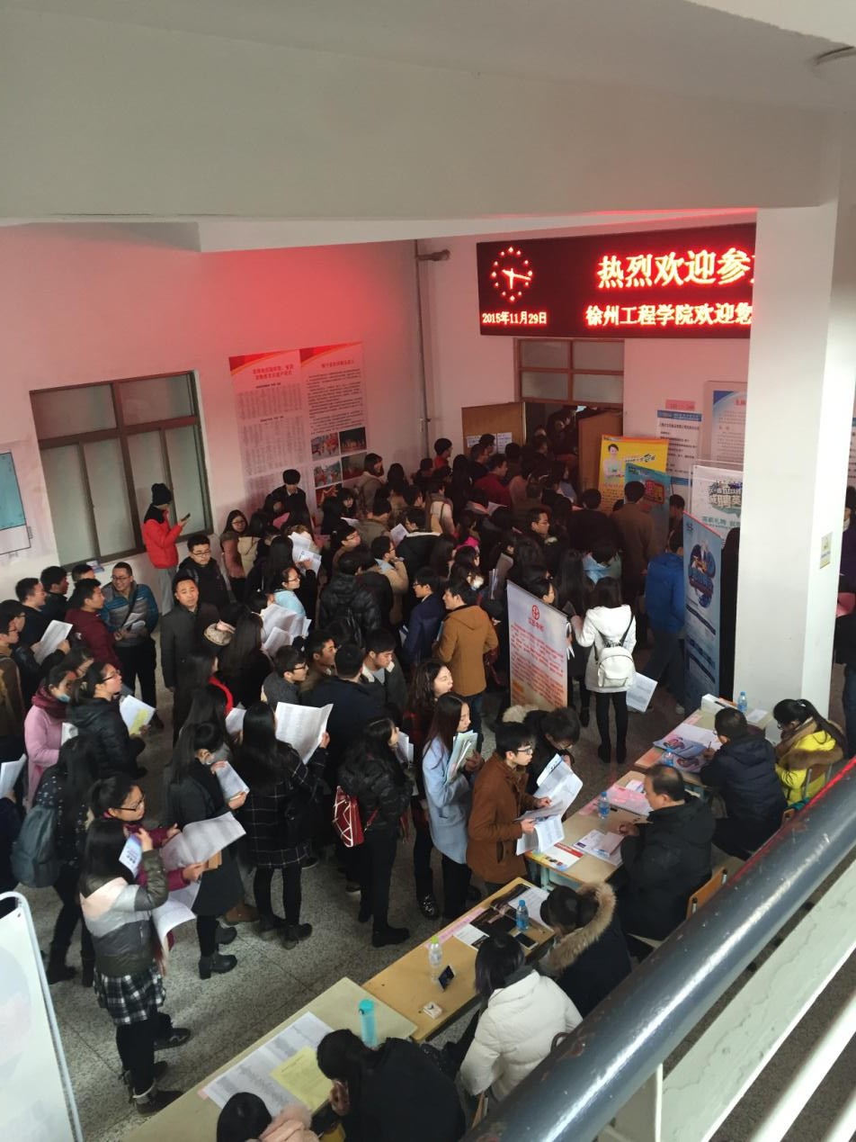 2015年11月29日,麒祥來到美麗的徐州,參加徐州工程學院2016屆畢業生就業雙選會。此次參會企業眾多,招聘現場人頭攢動。雖然天氣寒冷,但是仍不減同學們的熱情。