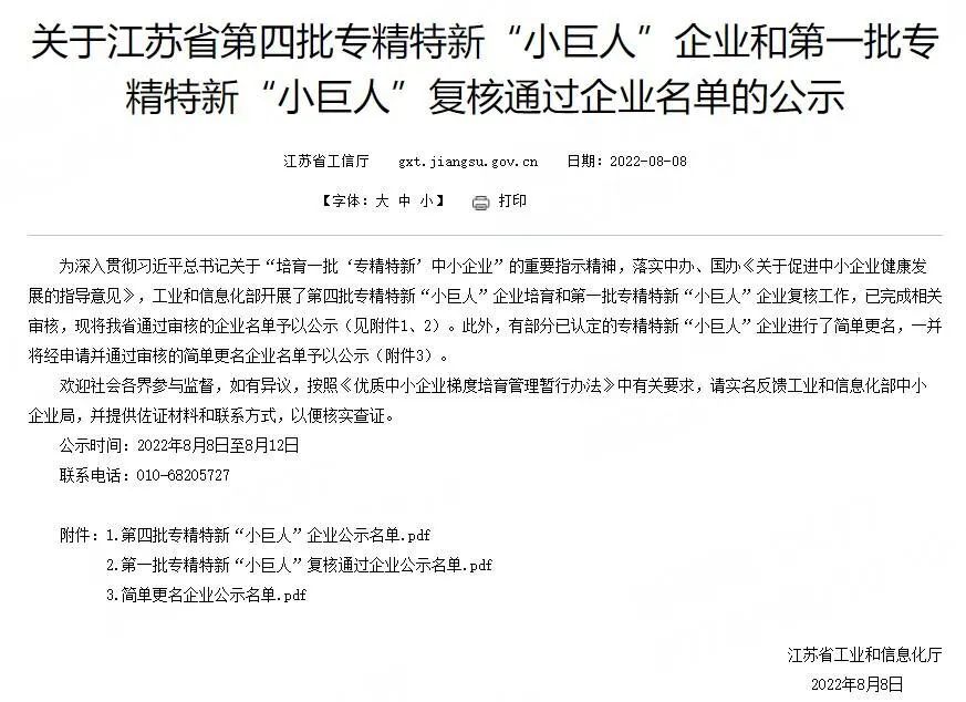 2022年8月8日,工信部委托江蘇省工信廳公示了第四批專精特新“小巨人”企業名單,麒祥新材料下屬子公司江蘇麒祥高新材料有限公司成功入選,榮獲專精特新“小巨人”稱號,實現了淮安工業園區專精特新“小巨人”企業零的突破。